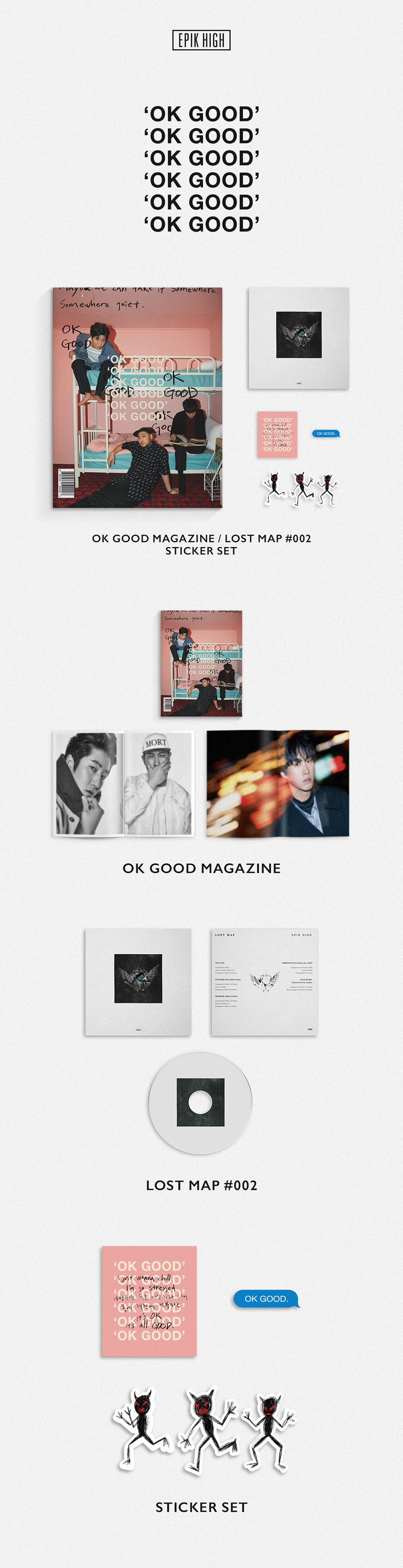 ‘OK GOOD MAGAZINE PACKAGE’는 컬렉터즈 에디션 매거진 ‘OK GOOD’과 온라인 음원 공개 없이 CD로만 제작된 비정규앨범 ‘LOST MAP 2’로 구성되어 있다. 에픽하이의 이번 앨범 ‘LOST MAP 2’는 보고 즐기는 음악이 당연해진 요즘, ‘듣는 가치’를 새겨주며 기존의 앨범 발매 관습을 모두 깨버리는 파격적인 행보를 보인다. 관상용으로의 가치만 남은 CD라는 사물을 원래의 쓰임으로 돌려놓고, 온라인 스트리밍이 아닌 CDP와 이어폰을 통해 에픽하이의 ‘음악’을 온전하게 전하길 원하는 아티스트의 진심이 담겨있다.