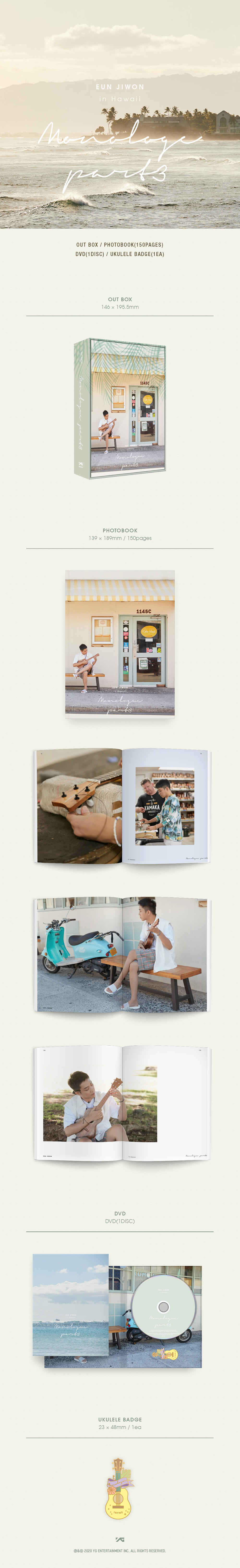 특별히 이번 하와이 영상은 은지원의 감미로운 내레이션을 담아 함께 여행하는 기분이 들게 하며, 구성은 포토북(PHOTOBOOK) 총 150페이지와 은지원 팬클럽인 원카인(1KYNE)만을 위한 우쿨렐레 배지(BADGE)가 함께 패키지 되어있다.